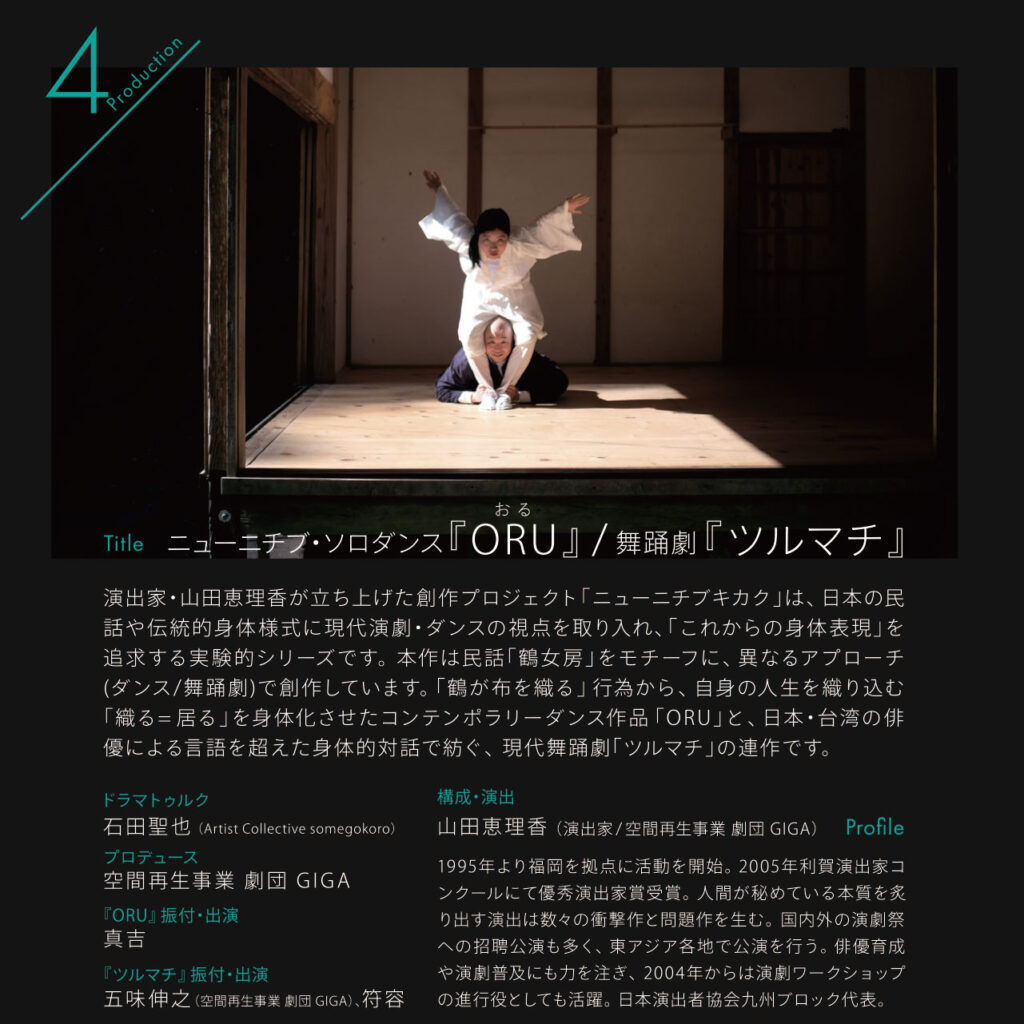 演出家・山田恵理香が立ち上げた創作プロジェクト「ニューニチブキカク」は、日本の民話や伝統的身体様式に現代演劇・ダンスの視点を取り入れ、「これからの身体表現」を追求する実験的シリーズです。本作は民話「鶴女房」をモチーフに、異なるアプローチ(ダンス/舞踊劇)で創作しています。「鶴が布を織る」行為から、自身の人生を織り込む「織る=居る」を身体化させたコンテンポラリーダンス作品「ORU」と、日本・台湾の俳優による言語を超えた身体的対話で紡ぐ、現代舞踊劇「ツルマチ」の連作です。